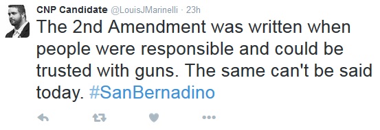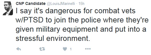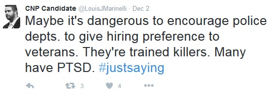 Marinelli has also taken to Twitter to share his opinions on a number of very hot political topics in a more direct manner than we’re used to hearing. The day of the San Bernardino shooting, while California law enforcement was being hailed for successfully stopping the shooters, Marinelli suggested that it might be dangerous to employ military veterans as police officers because “They’re trained killers” and “many have PTSD” and calling for a repeal of the Second Amendment because Americans can no longer be “trusted with guns”. What followed was a fascinating… um… dialogue between Marinelli and former Assemblyman Nathan Fletcher.