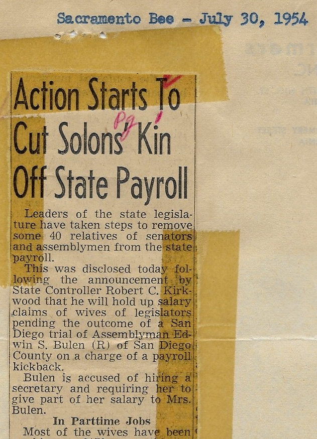 1954 (July) – Assemblyman Edwin S. Bulen was accused of hiring a secretary for his office (with the requirement that she pay part of her salary to his wife) State Controller Robert Kirkwood announced that he would be placing a hold on payments to legislator relatives working for the legislature. In late July, the Legislative Counsel determined that it was illegal for legislators to hire a “dependent relative” and on July 29th, the legislature began the process of removing legislative spouses and family members as staffers.