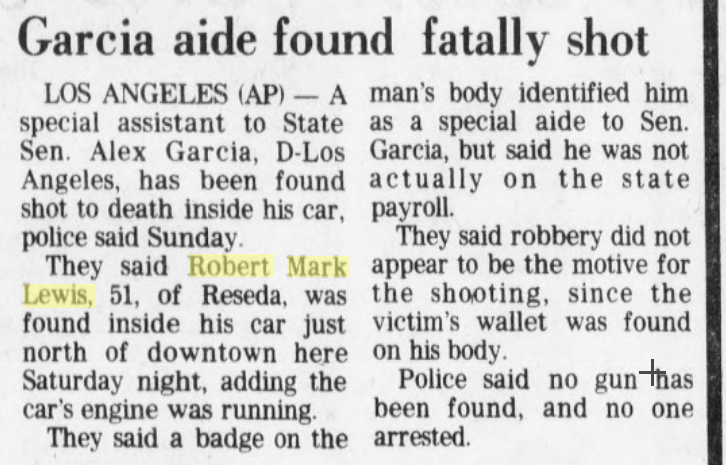 1977 (January 15) – Robert Mark Lewis, a Special Assistant to State Senator Alex P. Garcia, was assassinated by members of the Mexican Mafia. He was shot to death in a car in the Echo Park area of Los Angeles. In April 1984, Anthony Delia Jr. admitted in court that he was involved in the murder of Lewis.