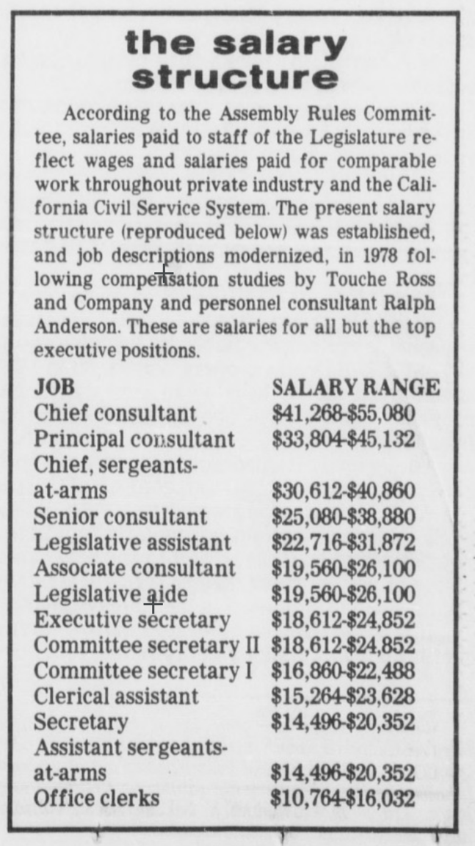 1973 (August) – The legislature was cited as employing 1,500 professional staff (with 800 working in the Capitol). A study by Assemblyman Walter Karabian found that women held 19 out of 163 committee consultant positions in the Assembly and 5 out of 89 in the Senate. “In the Assembly, the usual staff allocation for each member is two secretaries in the Capitol and one administrative assistant in the district office. In the Senate, each member is entitled to at least two secretaries and an administrative assistant (AA) in the Capitol.”