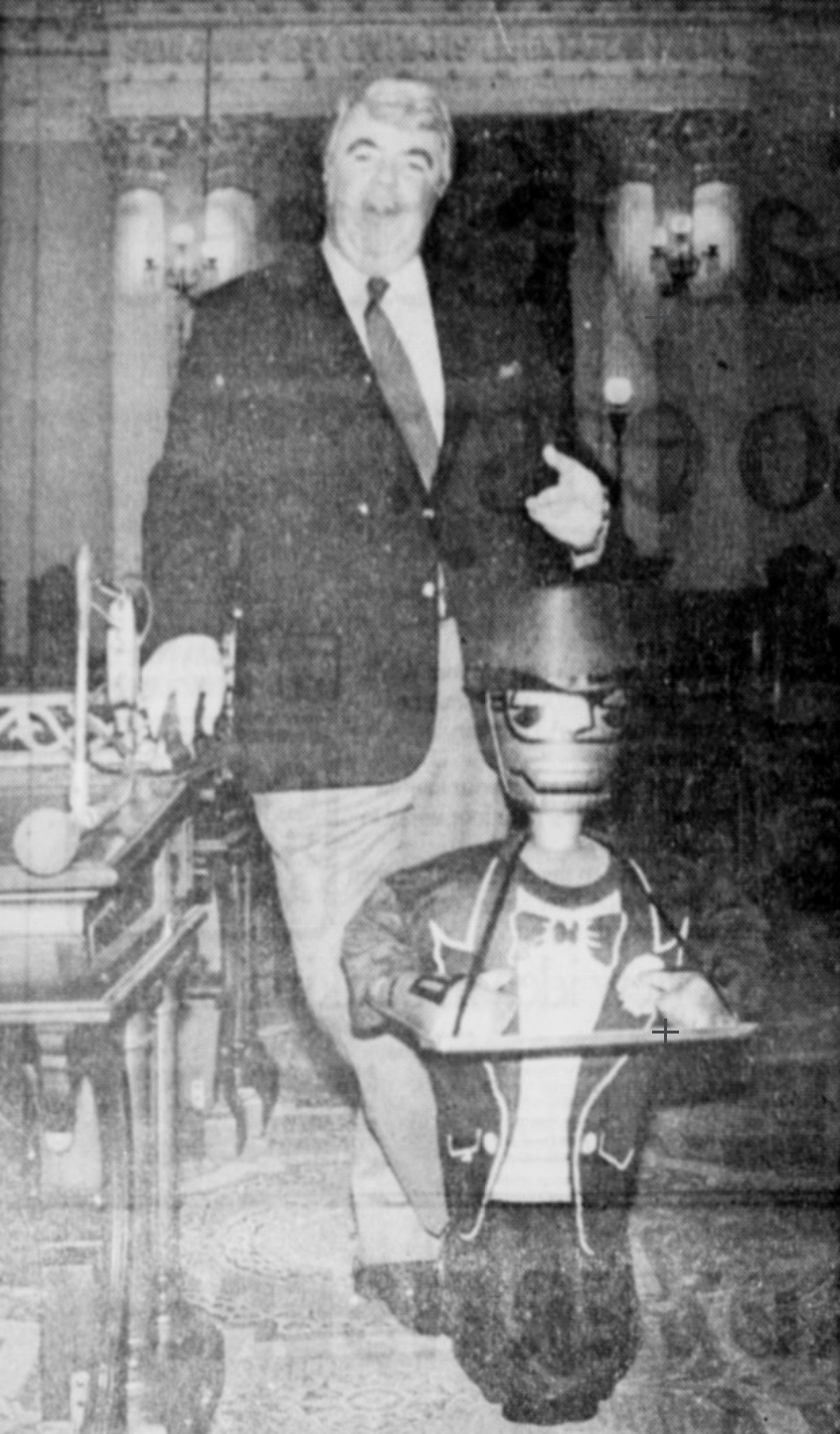 1985 (January) – Following the passage of Proposition 24, forcing a reduction in expenditures on legislative staff, Senator Bill Campbell “hired” the first robotic legislative staffer, a battery-powered robot named Solon. Solon, who appeared with Senator Campbell on the Senate Floor carrying a tray, Campbell joked that the robot “will function as well as some of the other members of the staff.”